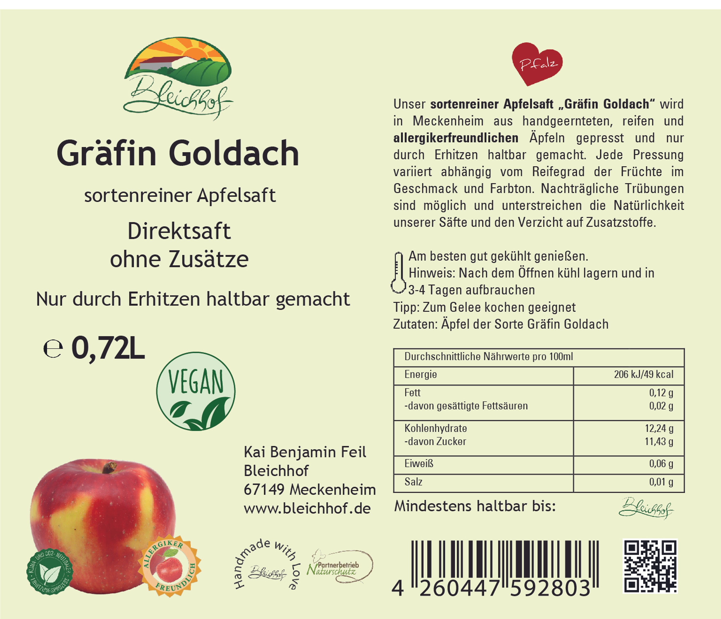 BLEICHHOF® apple juice Gräfin Goldach - direct juice, pure variety, allergy-friendly, vegan (1x0.72l)