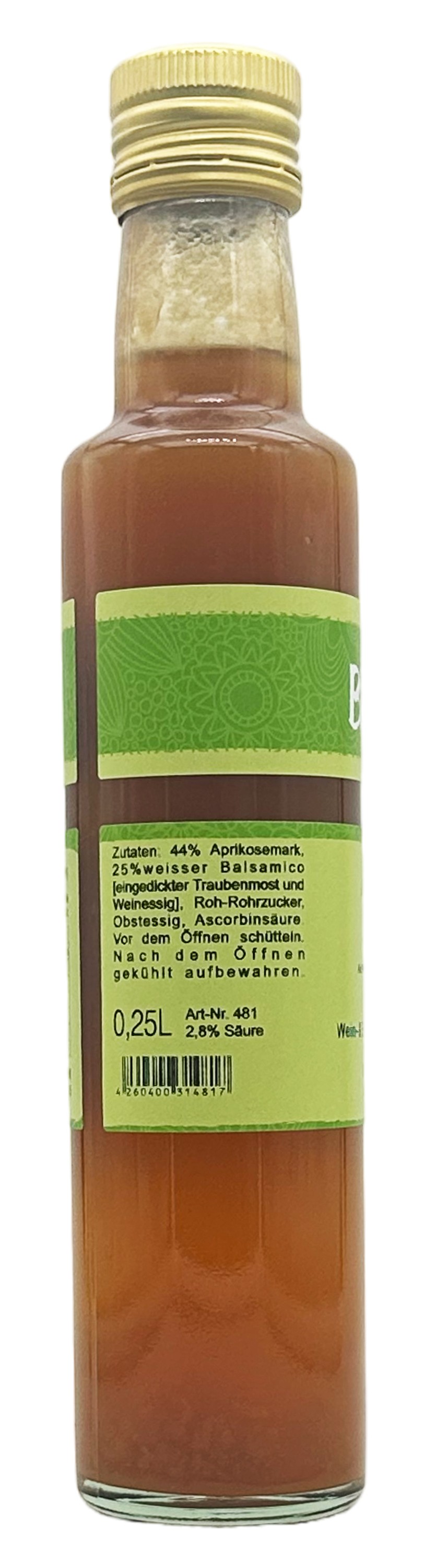 Ingredients: 44% apricot pulp, 25% white balsamic vinegar (thickened grape must and wine vinegar), raw cane sugar, fruit vinegar, ascorbic acid.
