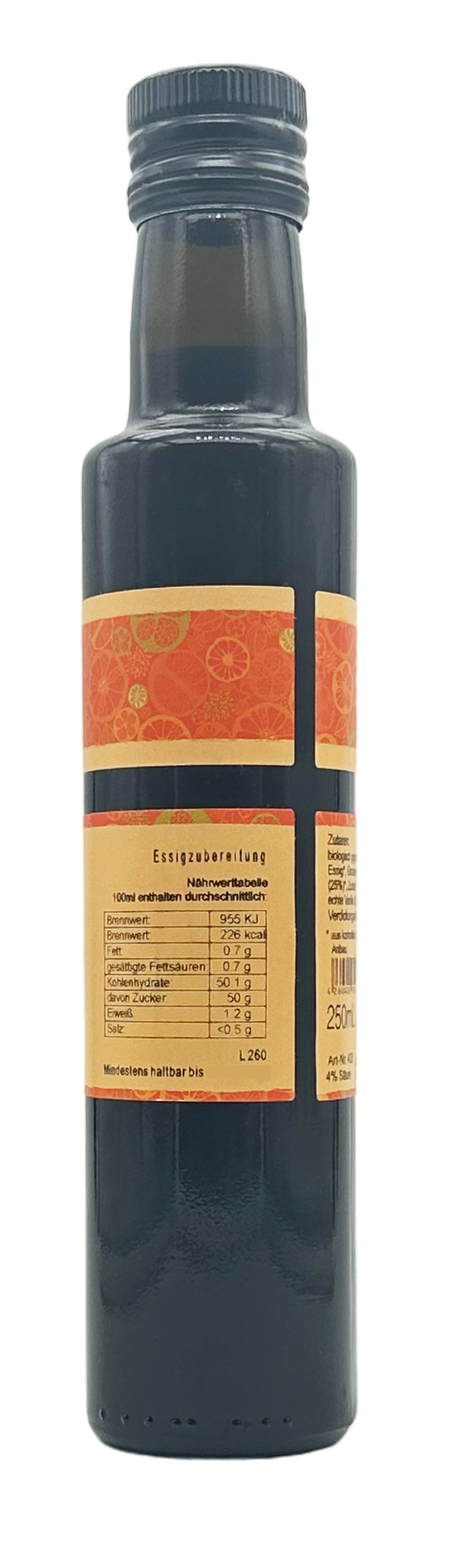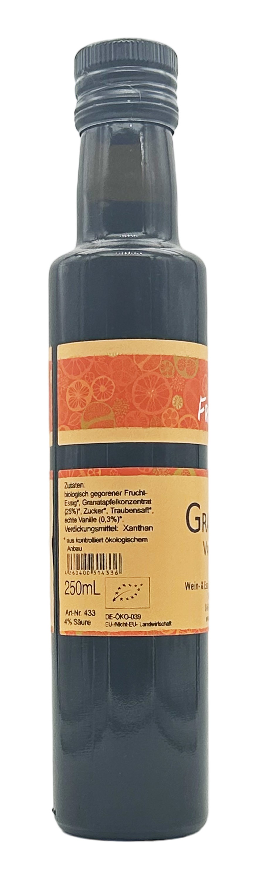 Ingredients: organic fermented fruit vinegar*, pomegranate concentrate (25%)*, sugar*, grape juice*, real vanilla (0.3%)*