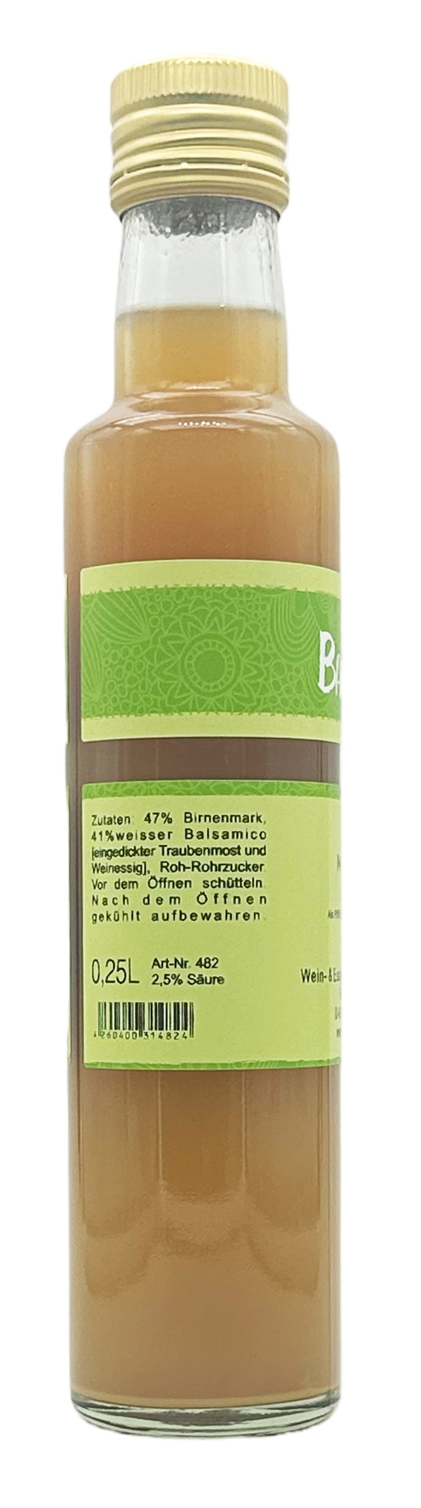Ingredients: 47% pear puree, 41% white balsamic vinegar (thickened grape must and wine vinegar), raw cane sugar.