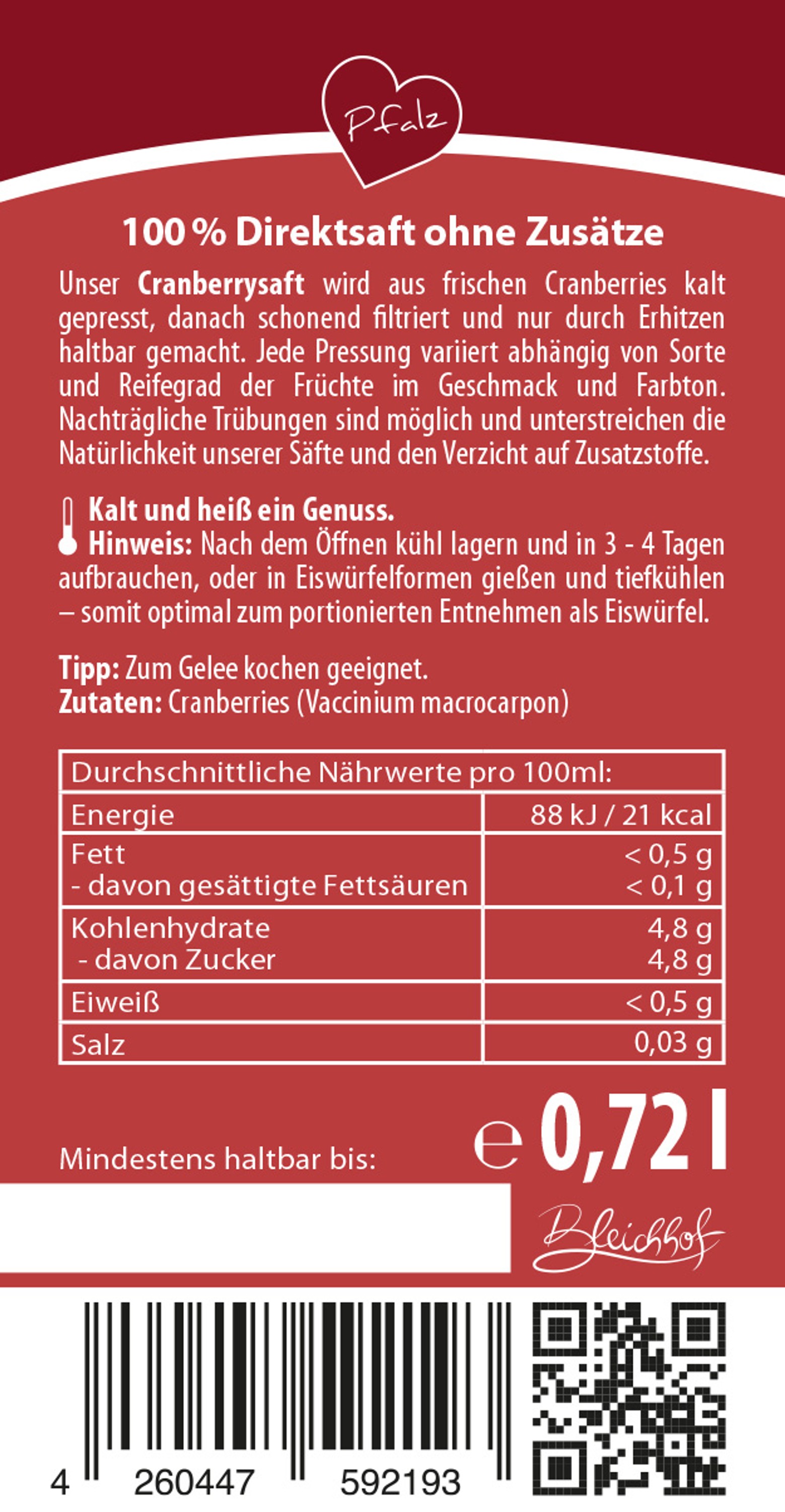 Unser Cranberrysaft wird aus kanadischen Cranberries frisch gekeltert, danach schonend filtriert und nur durch Erhitzen haltbar gemacht. Jede Pressung variiert abhängig von Sorte und Reifegrad der Früchte im Geschmack und Farbton, nachträgliche Trübungen sind möglich und unterstreichen die Natürlichkeit unserer Säfte und den Verzicht auf Zusatzstoffe