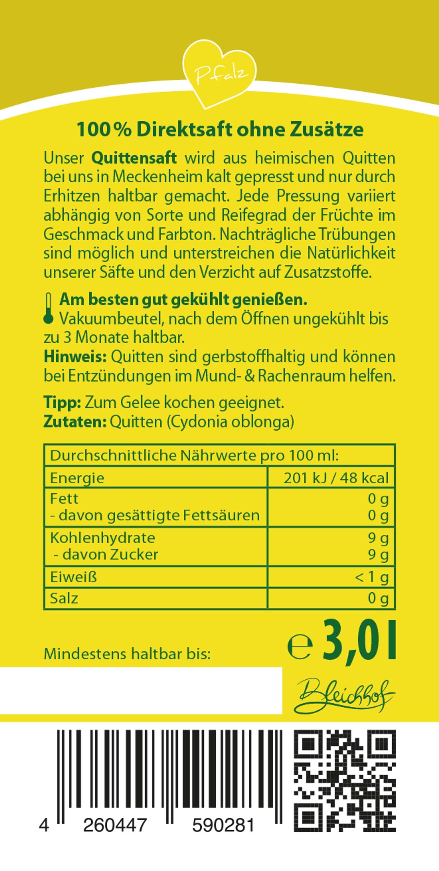 - Quittensaft: Unser Quittensaft wird aus heimischen Quitten frisch gekeltert und nur durch Erhitzen haltbar gemacht. Jede Pressung variiert abhängig von Sorte und Reifegrad der Fruchte im Geschmack und Farbton, nachträgliche Trubungen sind möglich und unterstreichen die Naturlichkeit unserer Säfte und den Verzicht auf Zusatzstoffe.